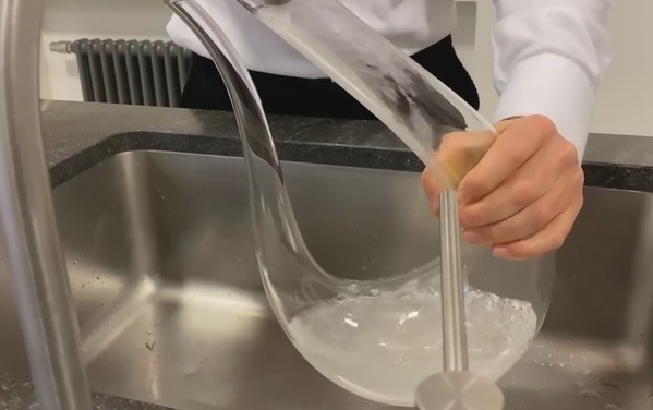 Después de utilizarlo, aclara el decantador inmediatamente con agua limpia; llénalo con agua y deja reposar toda la noche. Dependiendo de la dureza y la calidad del agua del grifo, es recomendable utilizar agua destilada porque un agua muy alcalina puede enturbiar el cristal. El agua destilada tampoco tiene ningún aroma ni contiene minerales, lo que previene la aparición de marcas del agua cuando se seque el decantador. Al día siguiente, retira el agua y rellena el decantador con medio litro aproximadamente de agua destilada. Agita el decantador con el agua destilada y viértela. También puedes utilizar agua con zumo de limón o esencia de vinagre para limpiar el decantador. A continuación, enjuaga bien para evitar los olores.